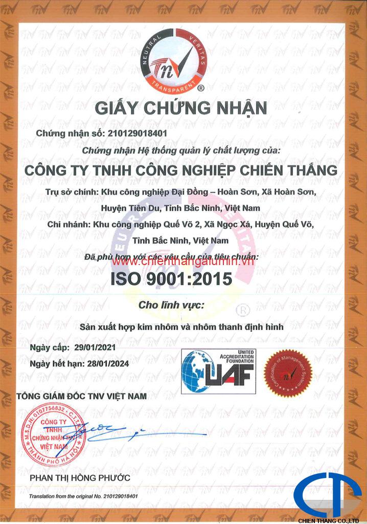Ngày 29/01/2021 sau khi được chuyên gia khảo sát > tư vấn đào tạo hệ thống tài liệu > đánh giá. Công ty TNHH Nhôm Tuấn Thành đã được cấp chứng nhận ISO 9001:2015